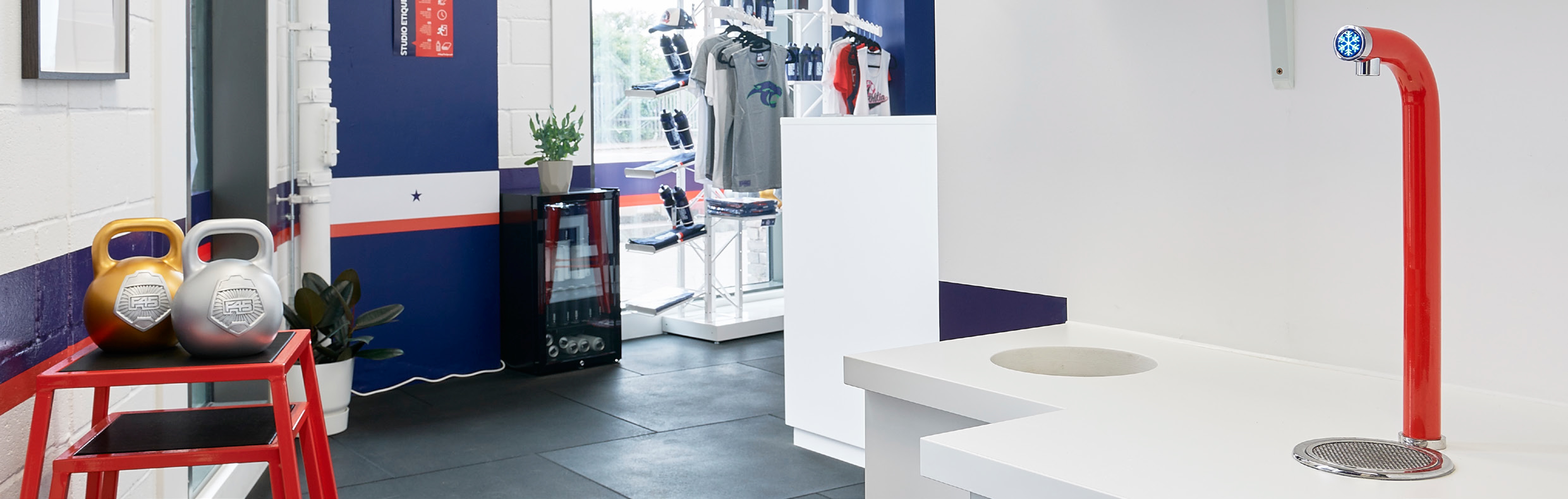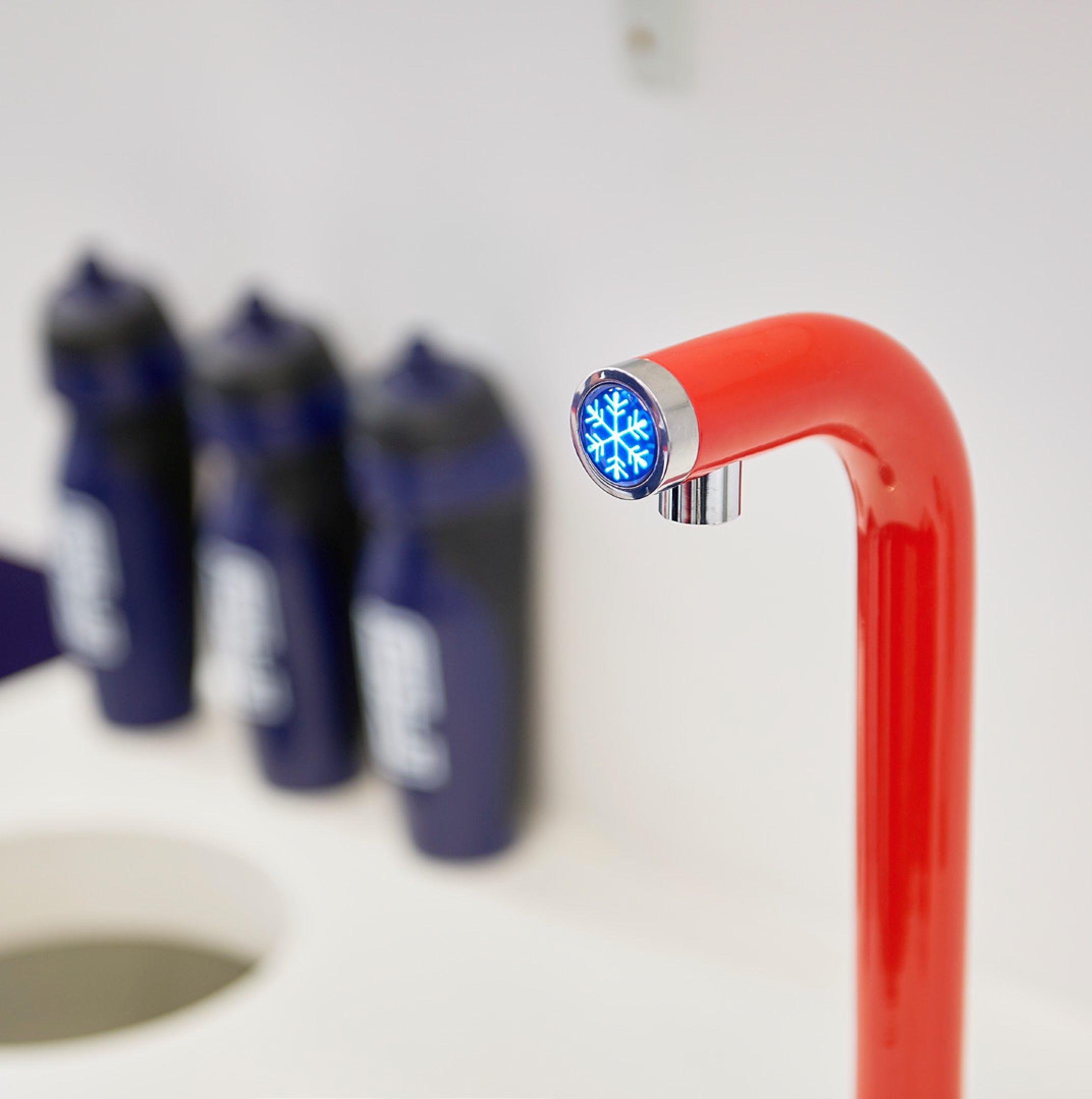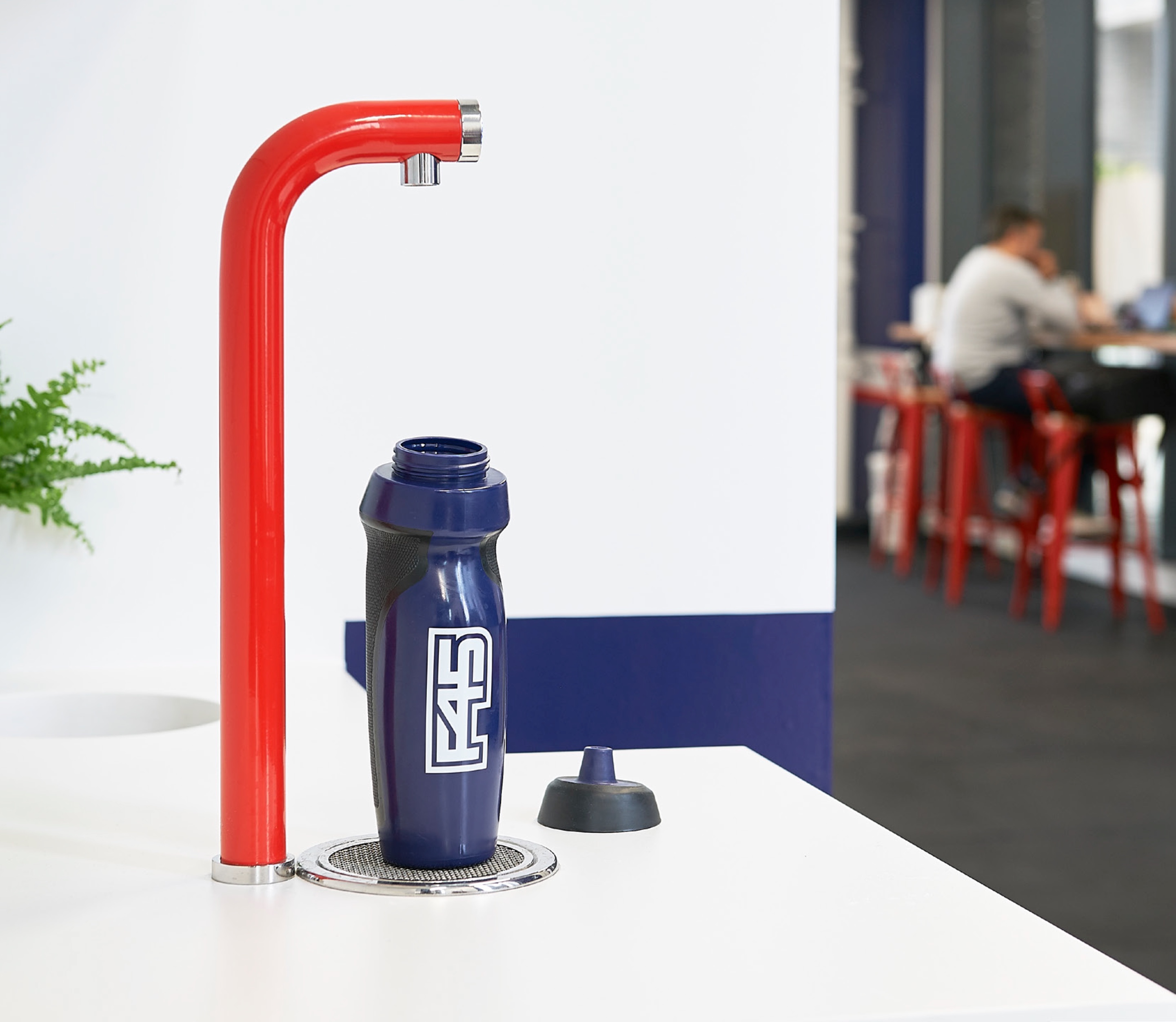 An Aqua Alto Tap that dispenses many litres of chilled, still water every hour. Because Aqua Alto is available in any colour, the studio team chose a red finish to match F45’s corporate branding.