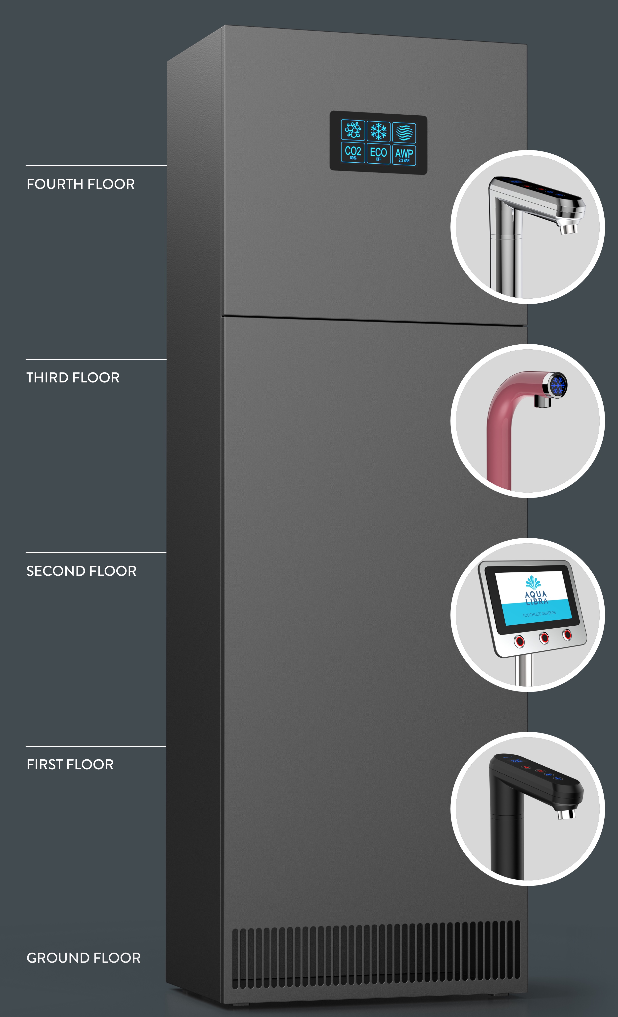 One centrally located control unit distributes filtered water to any number of water-dispenser outlets on any number of floors within a building, making Aqua Link up to 45% more cost effective and around 50% more energy efficient than individual water-dispense units.